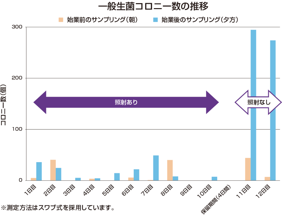 - 一般生菌のコロニー数が照射ありのトイレに比べ高くなっている