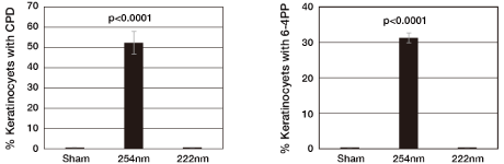 波長254nmと、波長222nmをマウスに157mJ/cm2照射。結果、波長254nmの照射においては、DNA損傷を示すCPD(シクロブタン型ピリミジン二量体)、ならびに6-4PP(6-4型光産物)の発生が確認されましたが、波長222nmの照射においては、DNA損傷は確認されませんでした(図1)。